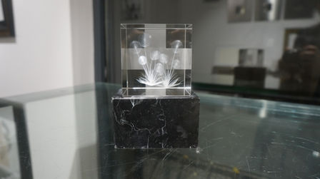 8 x 8 cm, kristal cam, lazer kazıma (İstenirse, duvara asılma aparatı ile birlikte )