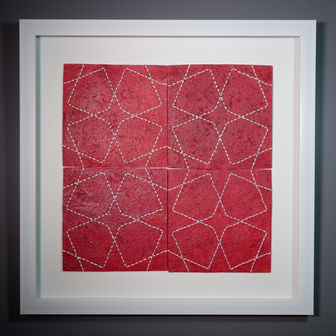 Machine stitching on found chest fabric, Chinese needle embroidered crate fabric, white work, sheep's wool